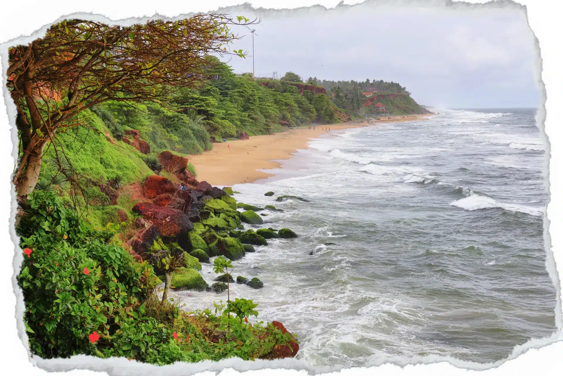 Varkala’s Major Beach is Varkala beach also known as the Papanasanam Beach. This beach is characterized by long winding stretch of cliffs adjacent to the gushing waves of the Arabian Sea, which makes for a picturesque view. Along the length of the cliff is the paved foot path, with quaint shops, hotels and coconut trees on either side. There are many other beaches along the stretch, like the Black Beach (named due to the black sand), Odayam Beach and Edava Beach. These beaches are perfect for swimming or to just laze around in the lap of nature.